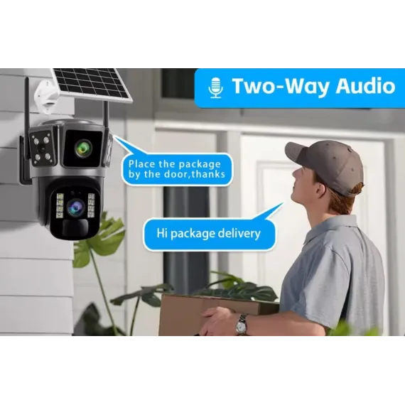 Specificatii Tehnice: • Rezolutie: 6MP (3MP + 3MP) • Vedere nocturna: LED alb + LED IR • Detectare miscare: Da, cu notificari pe telefon • Detectare umana: Da, cu incadrare automata a persoanelor • Monitorizare la distanta: Streaming video live, control de la distanta • Alimentare: Panou solar, 5V • Rezistenta: Impermeabil IP66 • Memorie: Suport pentru card MicroSD de maxim 128GB • Functii aditionale: Alarma cu sunet si flash in miscare, apel vocal