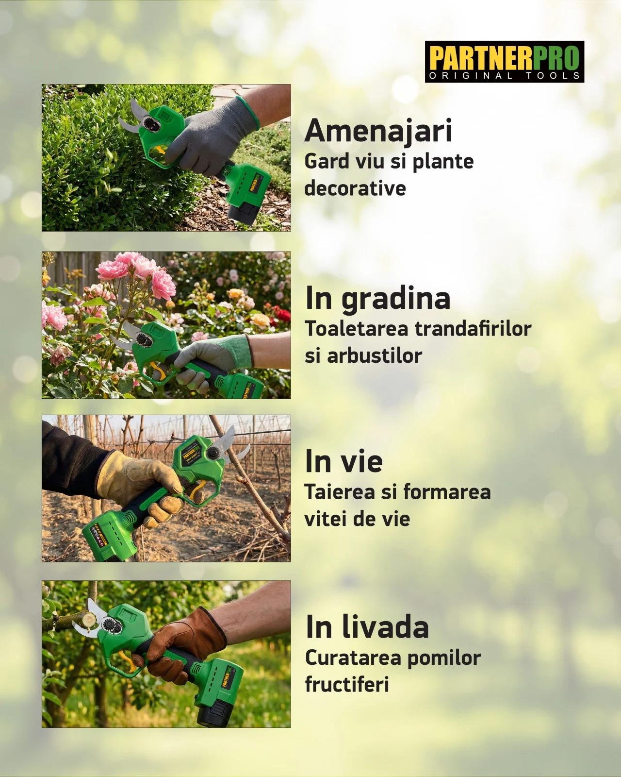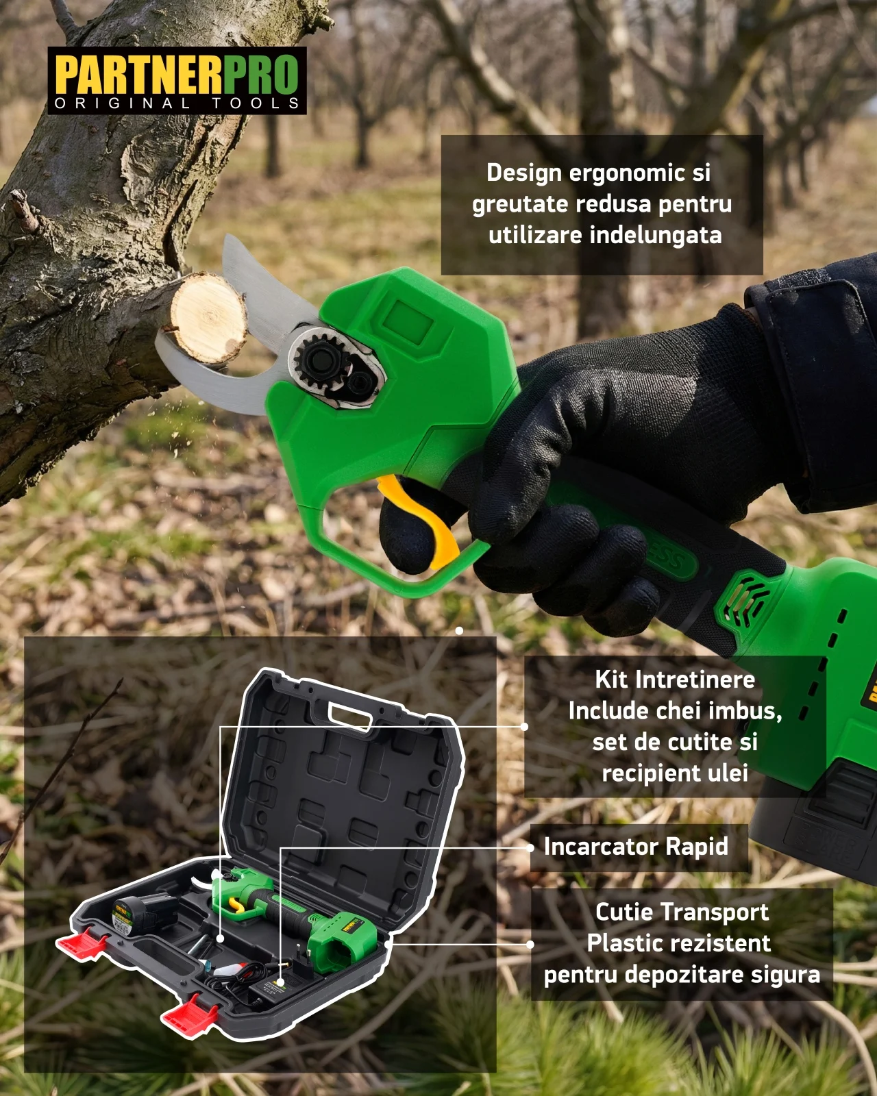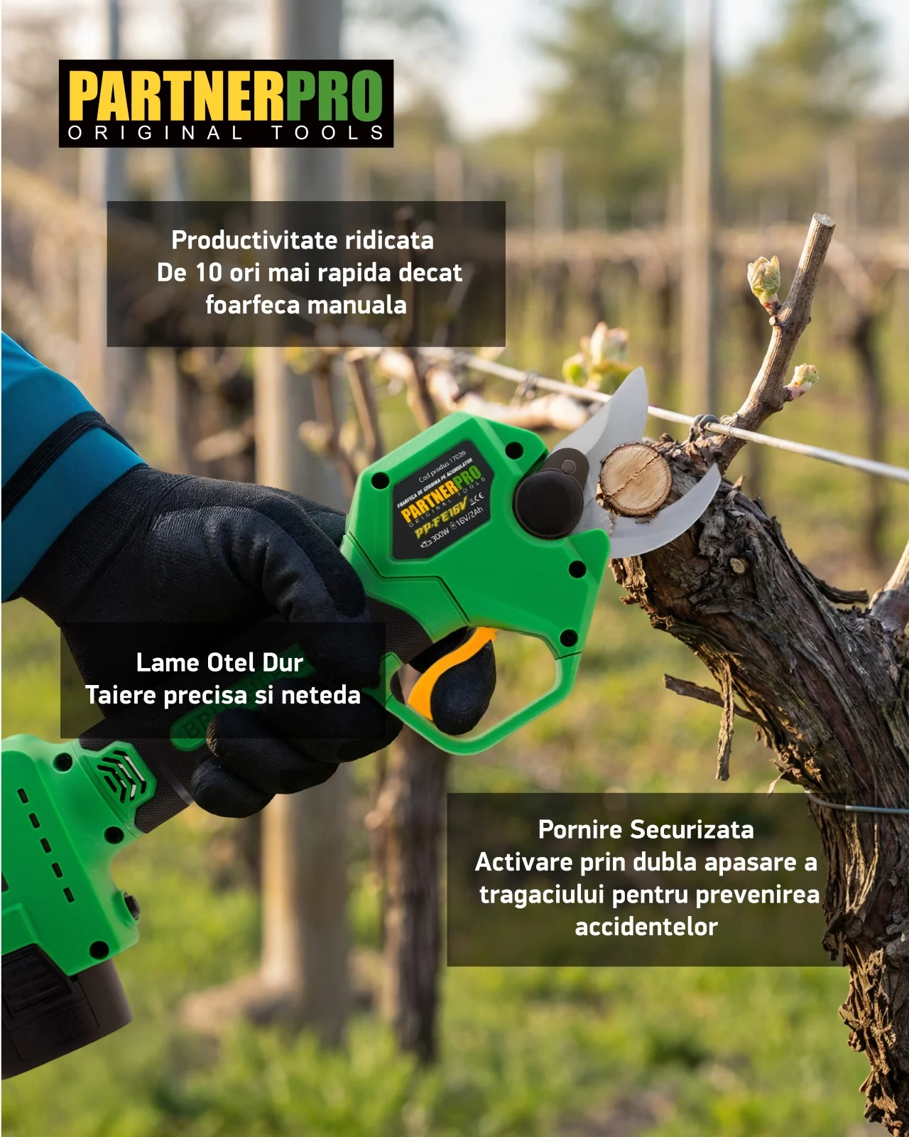 Foarfeca electrică PARTNERPRO PP-FE16V este un instrument modern, puternic și extrem de eficient, conceput pentru lucrări de tăiere precise în grădină, livadă sau gospodărie. Datorită construcției compacte și alimentării pe acumulator, această foarfecă oferă libertate totală de mișcare și un nivel ridicat de confort, fiind ideală atât pentru utilizatori pasionați de grădinărit, cât și pentru lucrări mai intense de întreținere a pomilor, arbuștilor sau viței-de-vie.