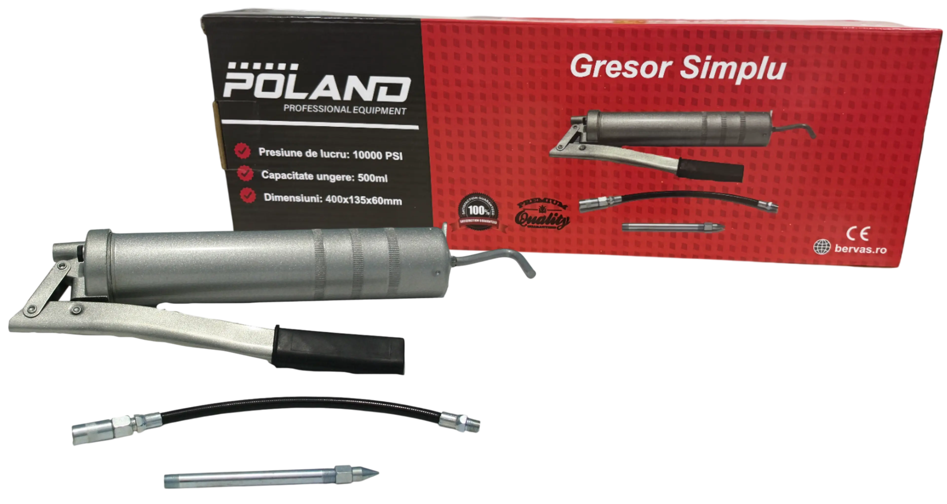 Gresor manual, ideal pentru lubrifierea echipamentelor și utilajelor din ateliere auto, ferme, construcții și industrie.
